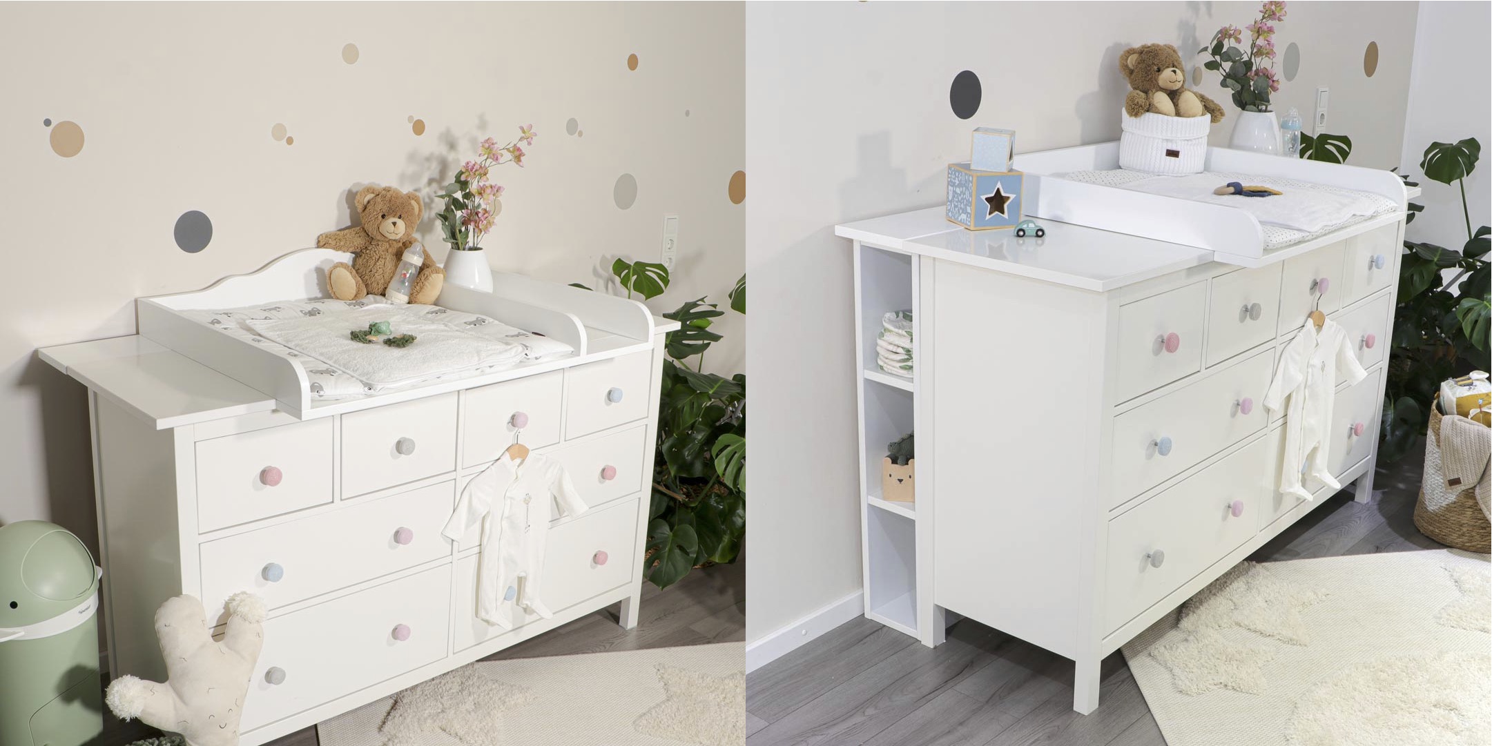 Например, такие накладки делает Puckdaddy (кстати, немецкая компания). Они предлагают накладки для шести обычных комодов IKEA (HEMNES, MALM, SONGESAND, BRIMNES, NORDLI, KOPPANG), а также ряд других аксессуаров, например, полочки для установки за комодом.