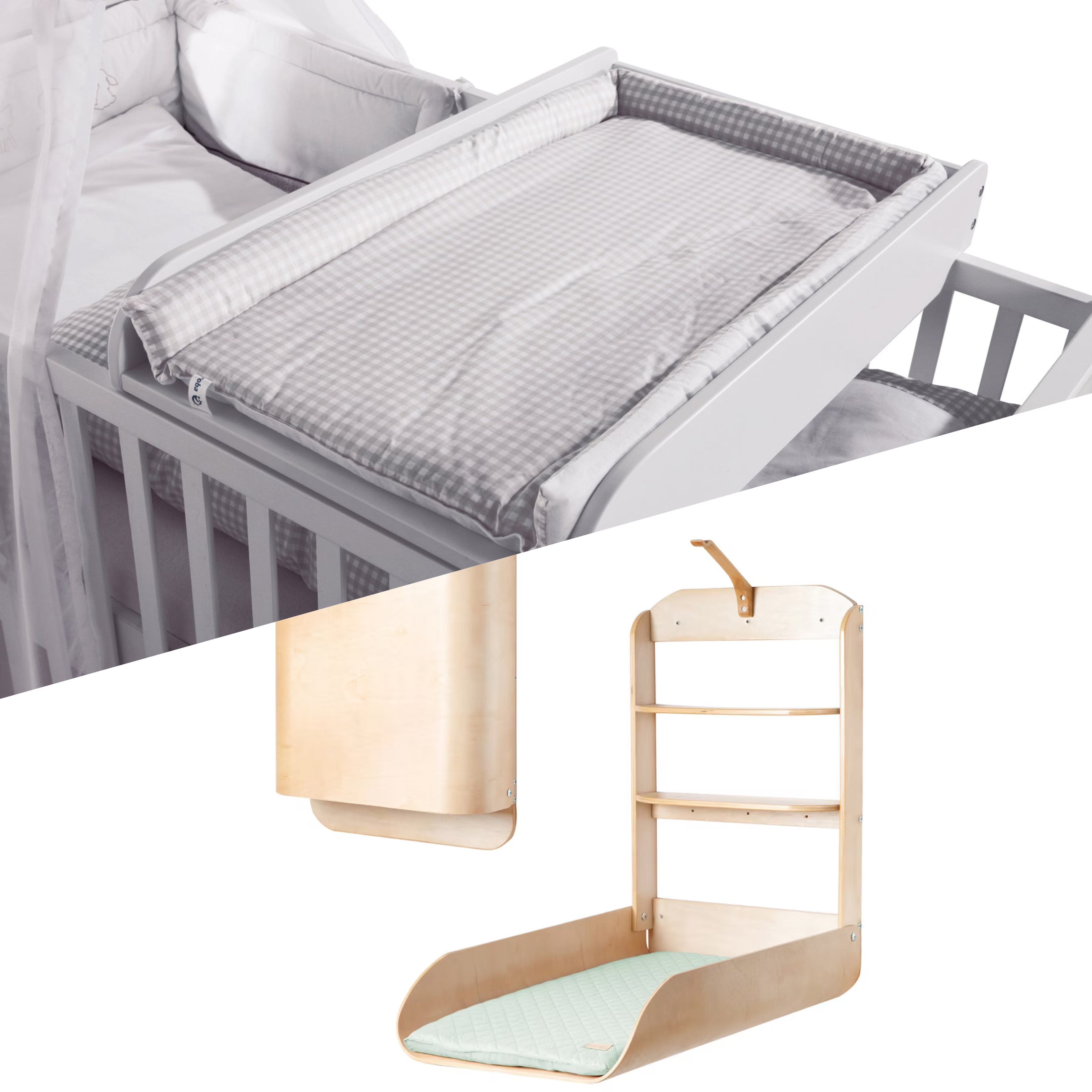 Если немного отойти от идеи совмещения комода и столика, то можно рассмотреть ещё две возможности для организации пеленания: пеленальную доску и подвесной столик. Оба варианта подойдут тем, кто хочет сэкономить место.
